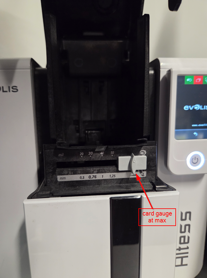 2. Set the card thickness gauge to MAX (all the way to the right) inside the input hopper
