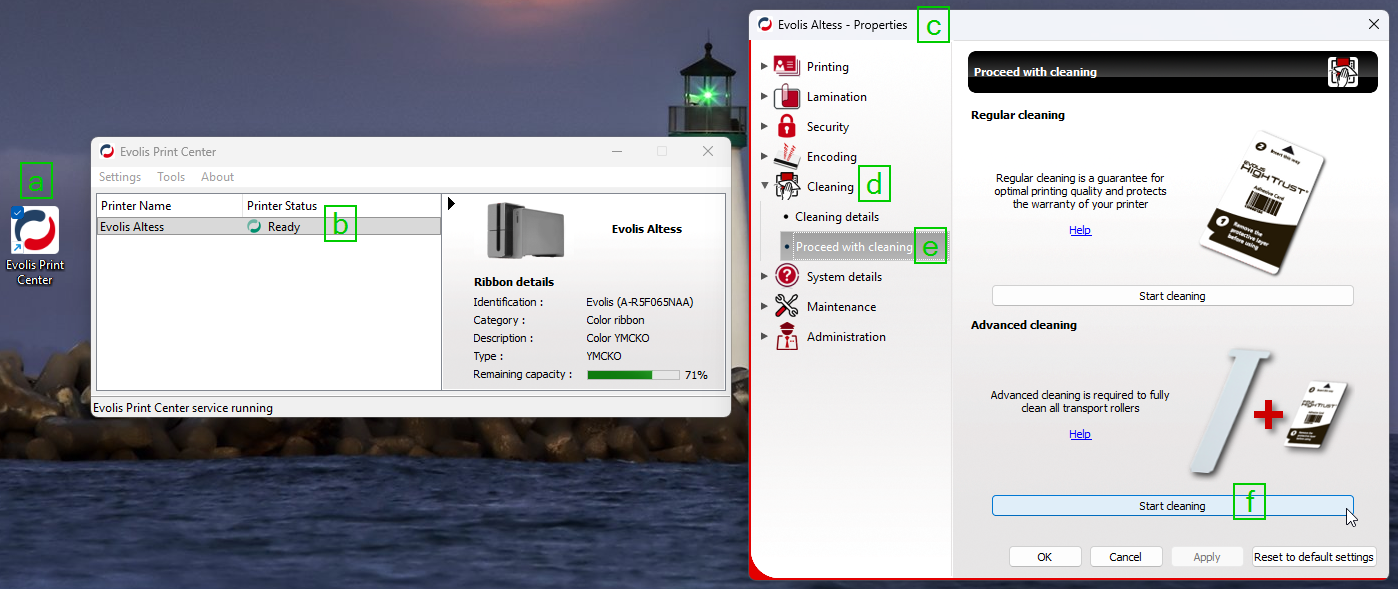 4. Open the Evolis Print Center app > Right-click on your printer > Properties > Cleaning > Proceed with Cleaning > Start Cleaning