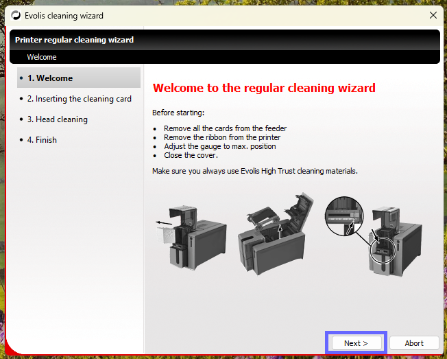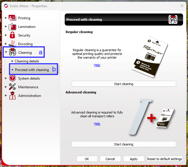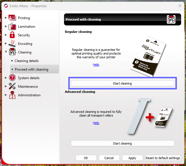 3. Select Start Cleaning under Regular Cleaning to open the Evolis Cleaning Wizard