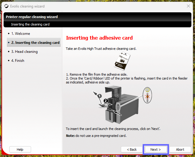 6. Place the Adhesive Cleaning Card sticky-side up into the input hopper and select Next onscreen
