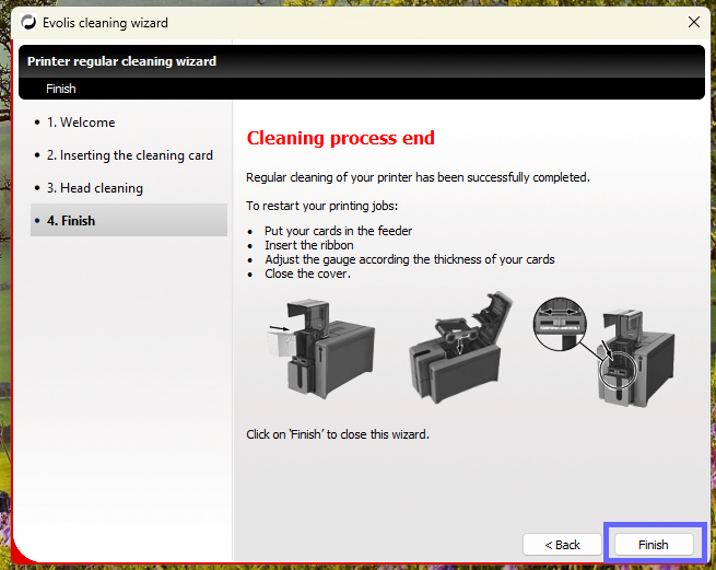 4. Remove the ribbon and cards from the printer. Set the Card Thickness Gauge to max. Close the top cover before you select Next onscreen.