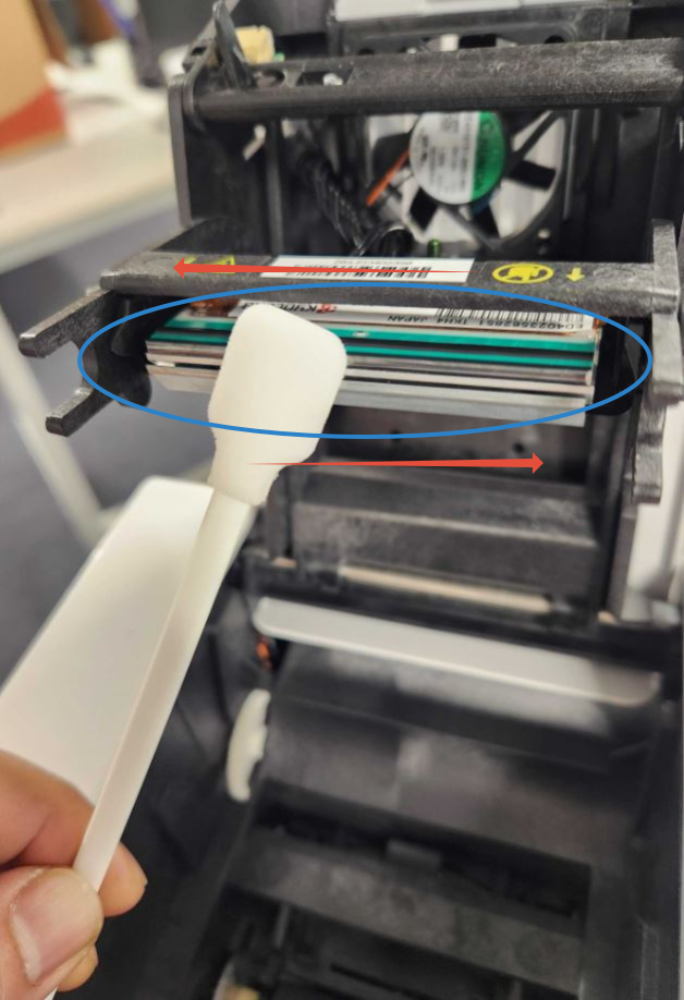 9. Open the top cover of the printer and gently wipe down the printhead with the alcohol swab