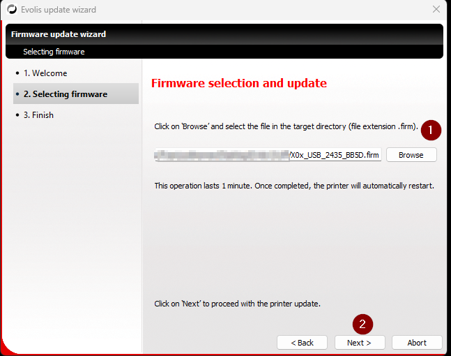 7. Click Browse to navigate to the firmware file you downloaded from Evolis > Select the .firm file