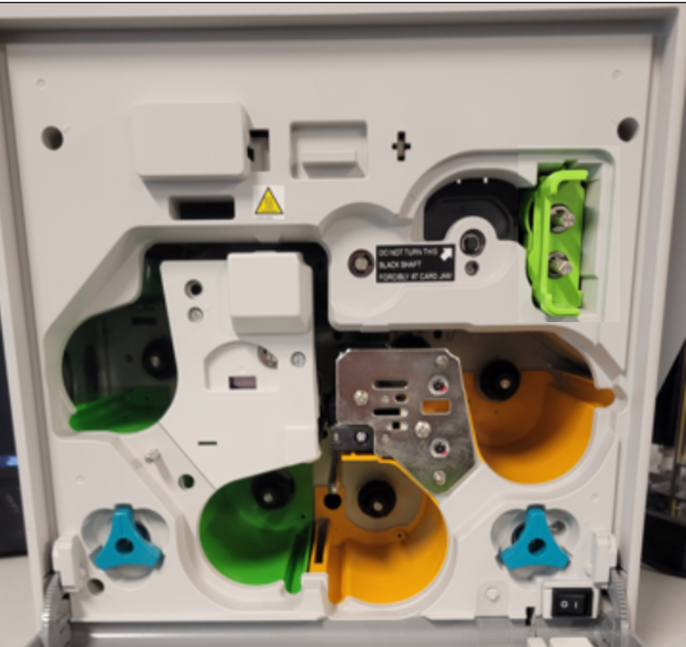 1. Remove the ribbon and card cartridge from the printer, see below