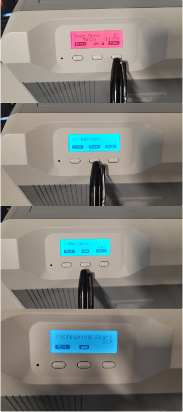 4. Select Cleaning Start and insert the cleaning card with the sticky side down and run it through 5-10 times
