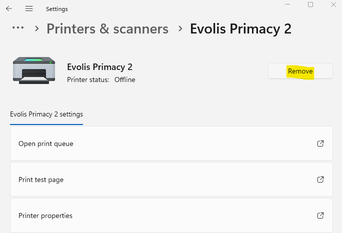 6. If the issue persists, try removing your printer and adding it back. Go to Printers & Scanners > Your Printer > Remove. Restart your computer, ensure the printer is plugged in, and check the Evolis Print Center app again