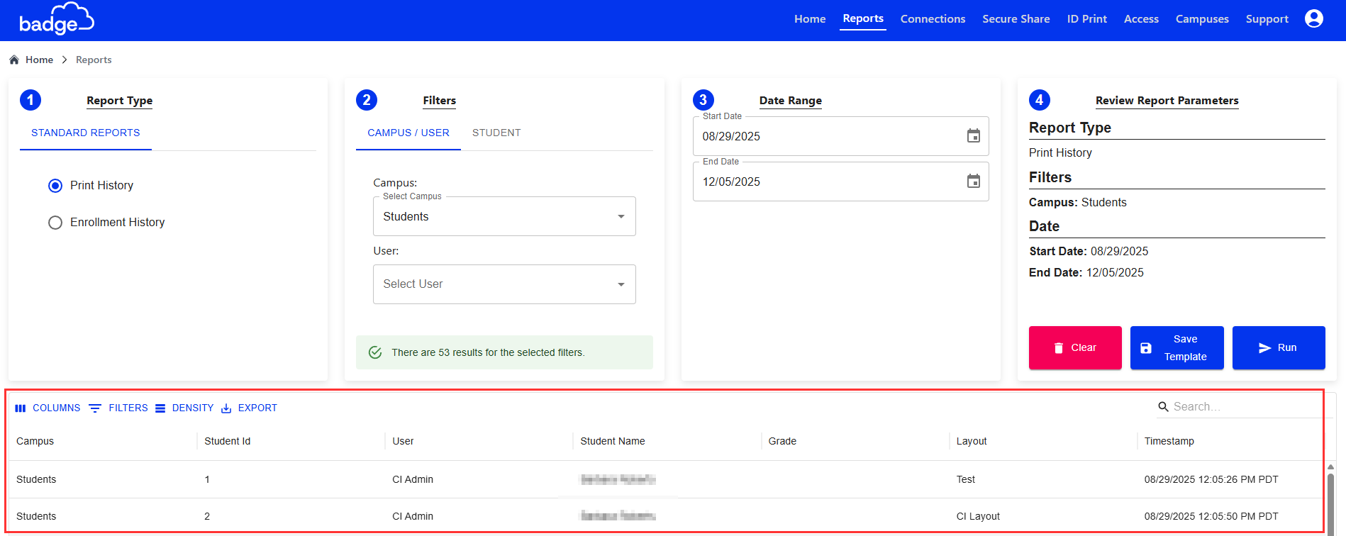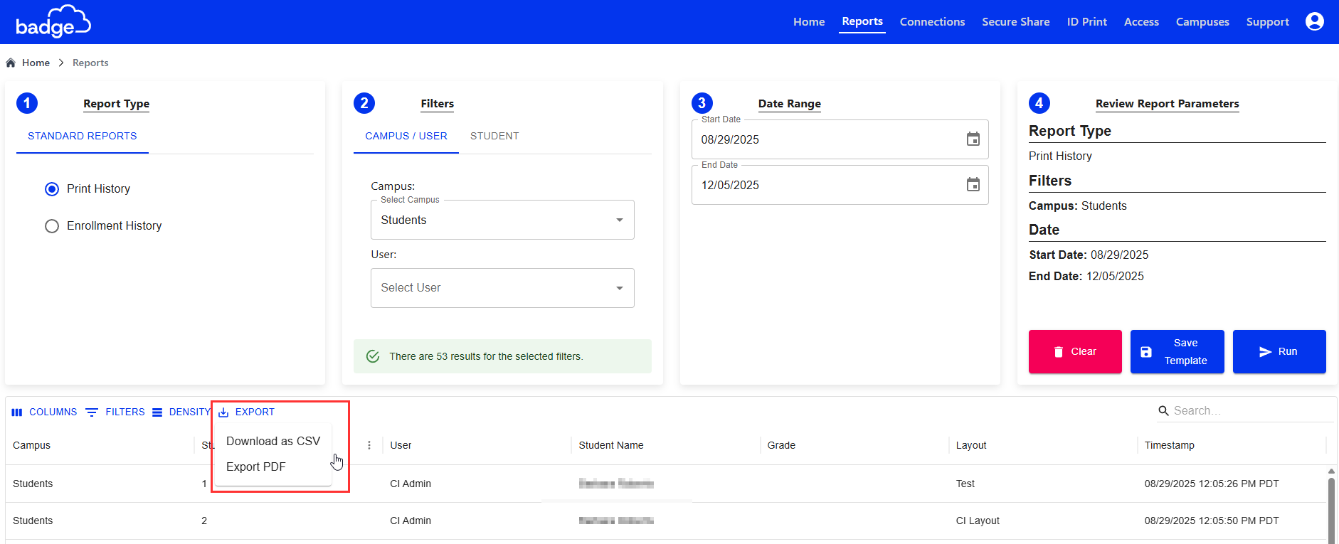 In Reports, Badge Owners/Operators can create and export reports to save in the computer. Badge Operators can only run and view reports of ID cards they specifically printed. Badge Owners have full access to view and run reports for all lists and records.