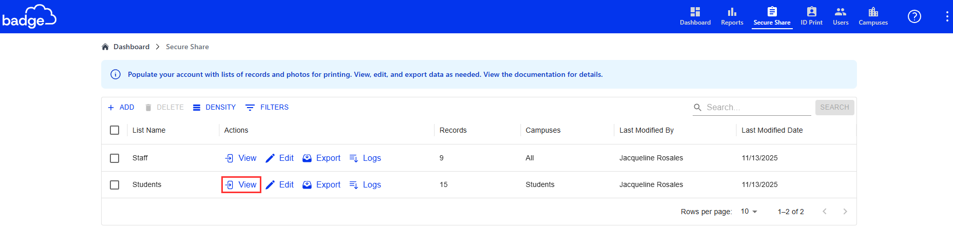 2. Find the List Name (e.g., school, staff, district, office) you want to view > Click VIEW