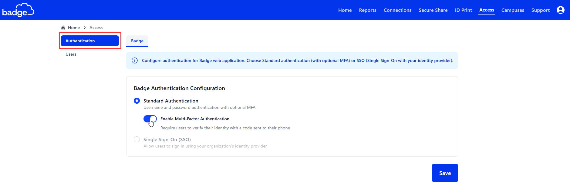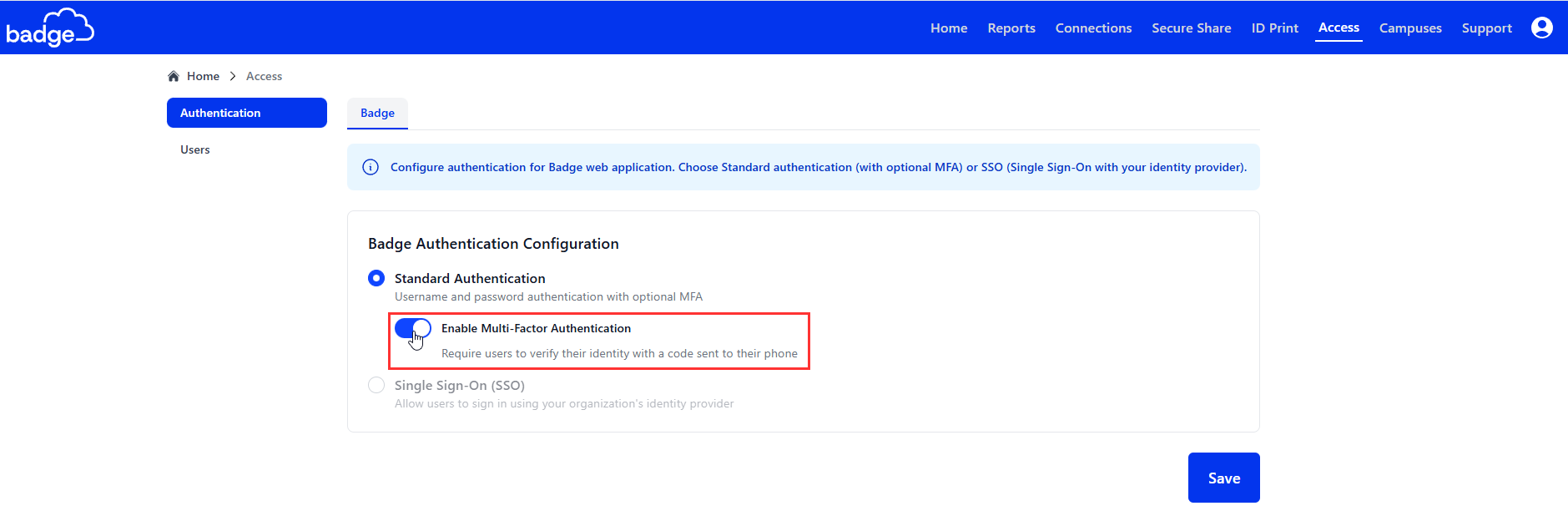 Badge Owners have the authorization to enable multifactor authentication (MFA).
