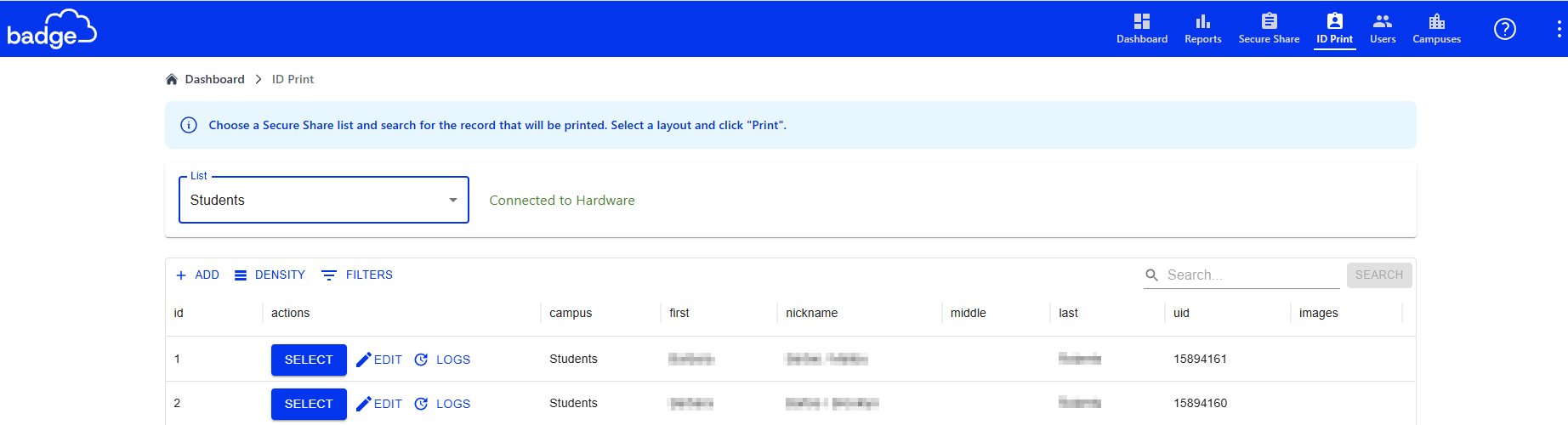 In ID Print, Badge Owners and Operators can navigate to one or many lists (schools, districts, offices) to add, update, and delete specific record data. In addition, Badge Owners and Operators are able to take pictures and print ID cards.