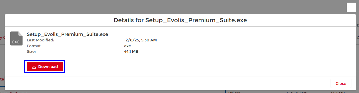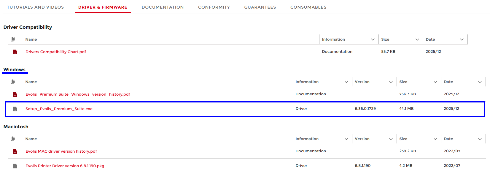 3. Navigate to the Windows section. Click on the Setup_Evolis_Premium_Suite.exe to access the installer