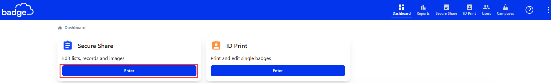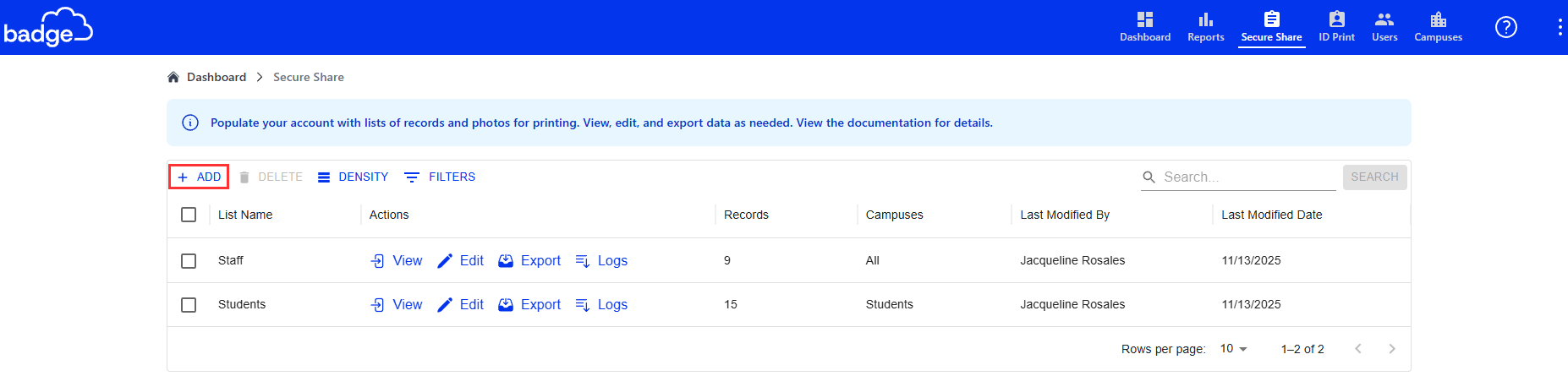 In Secure Share, Badge Owners can manually create a new list (e.g., ID and Campus)