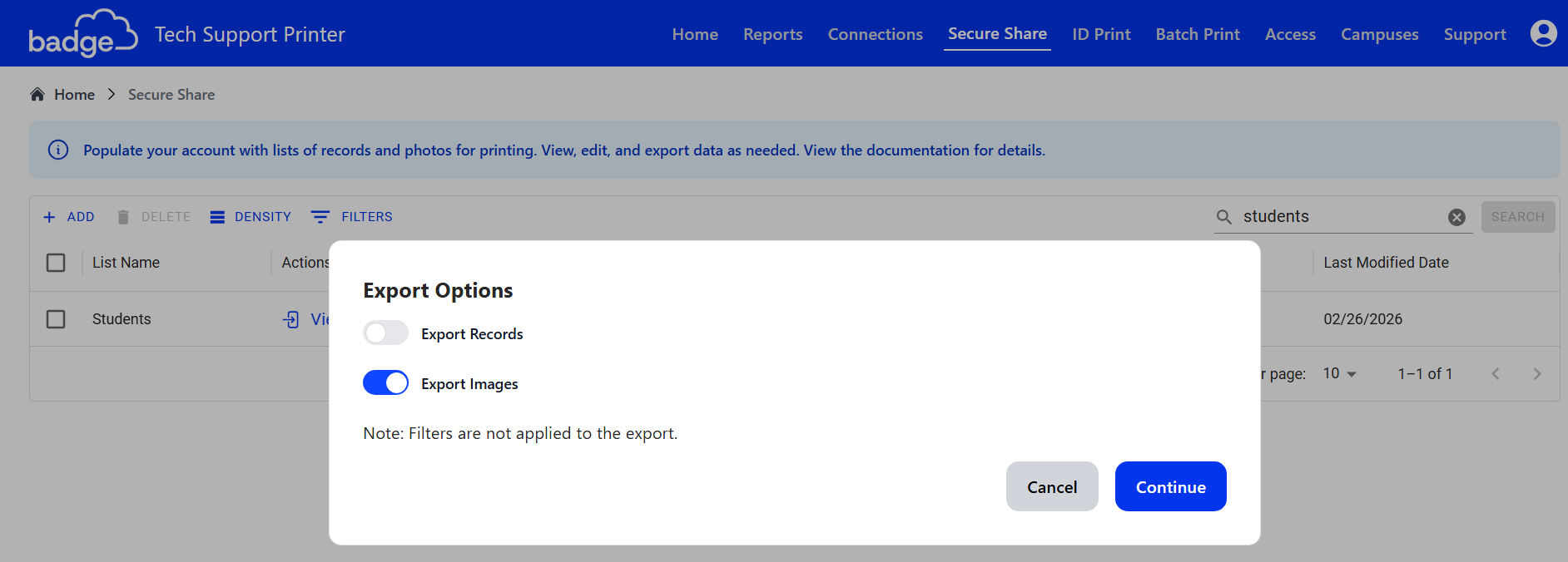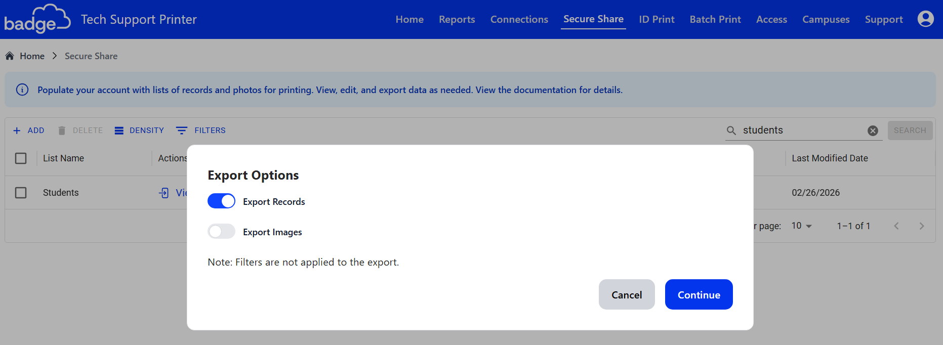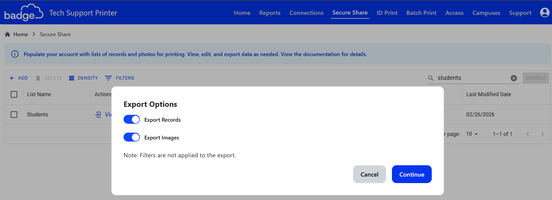 In Secure Share, Badge users can export a large set of data (collection of records and images) to their local computer.