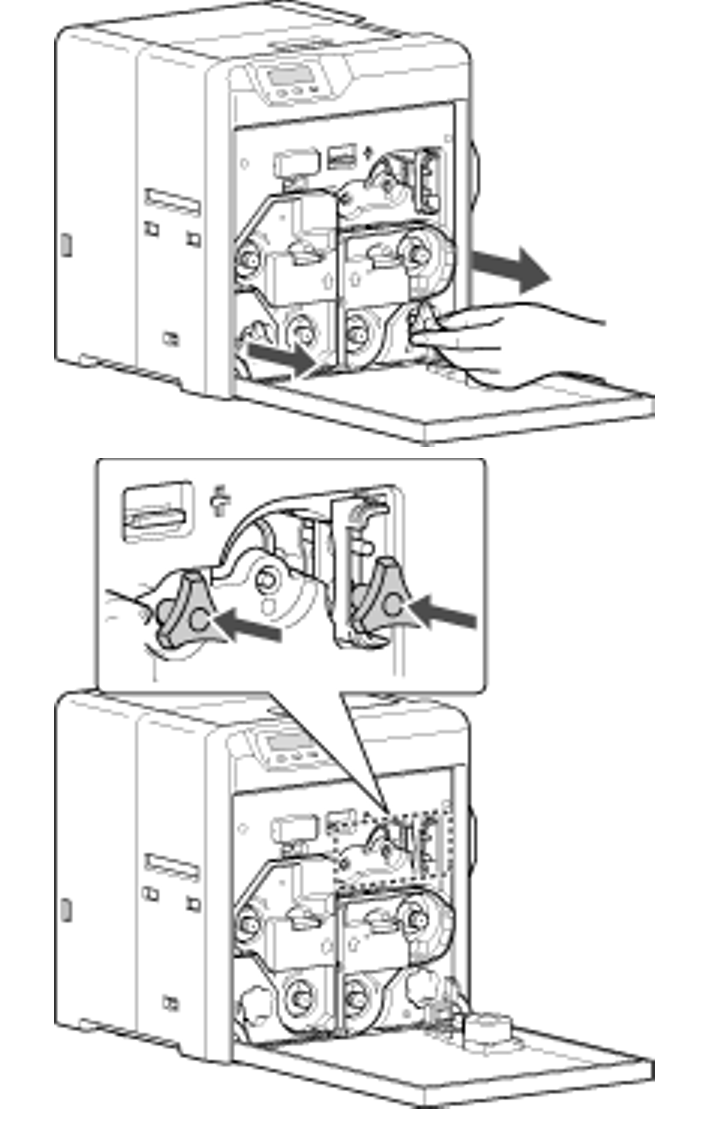 The card may melt if the card touches the orange roller.7. Insert the cleaning roller > Close the front panel