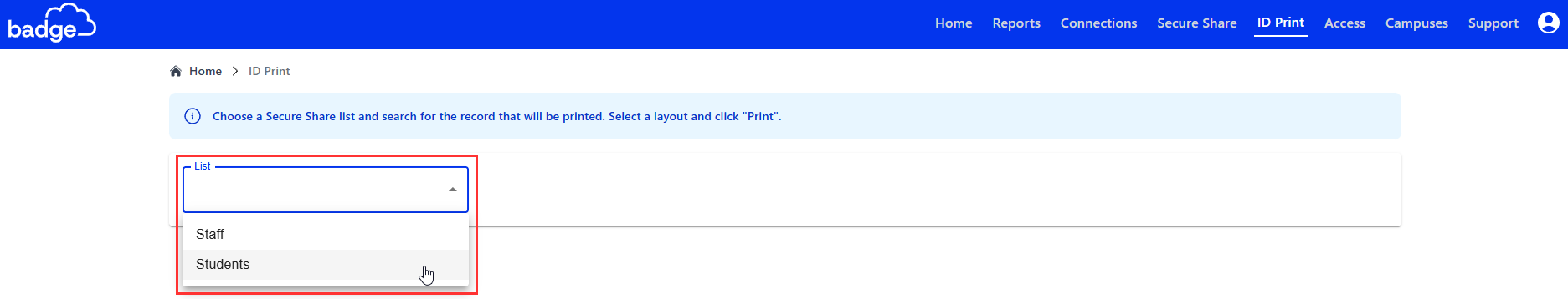 2. Click on the drop-down menu > Find and Select the List Name (e.g., school, staff, district, office) you want to view