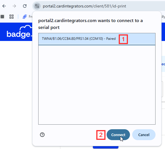 3. A pop-up window will appear with the printer's serial port > Select TWN4 > Click Connect