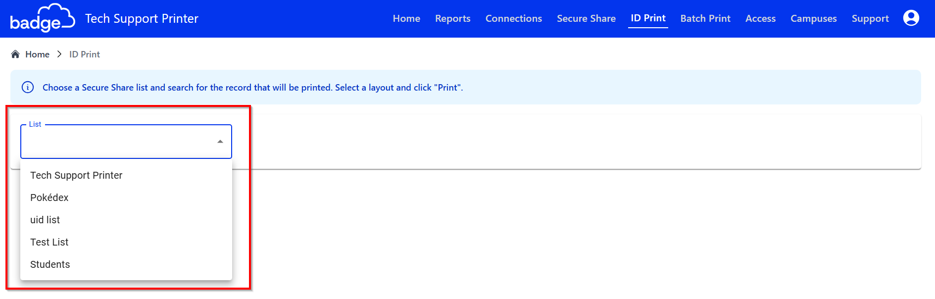 2. Click on the drop-down menu > Find and Select the List Name (e.g., school, staff, district, office) you want to view
