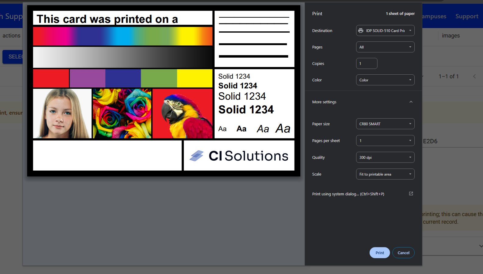 Make sure you have the correct printer selected Quality: 300 dpi Scale: Fit to Printable Area