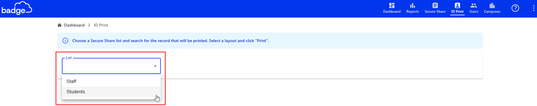 6. Click on the drop-down menu > Find the List Name (e.g., school, staff, district, office) you want to view > Select List