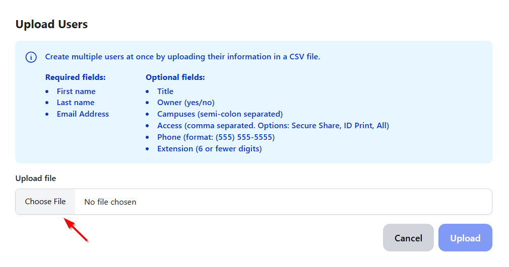 The Bulk User Upload feature allows Badge Owners to quickly create multiple user accounts by uploading a formatted CSV file. Each row in the CSV corresponds to one user account. This guide covers where to find the feature, the required and optional fields, formatting rules, and the validation logic applied during upload.