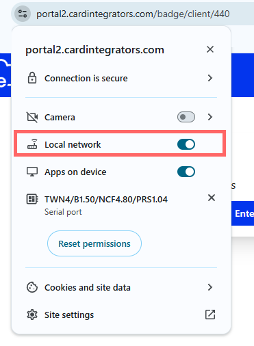 - Removes the Local Network Access prompt from specific websites (ie Badge at https://portal2.cardintegrators.com/)