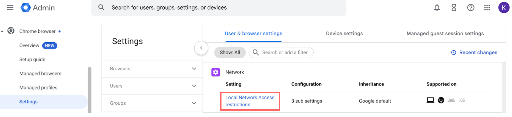 Block Local Network Access prompt for users in the Google Admin Console