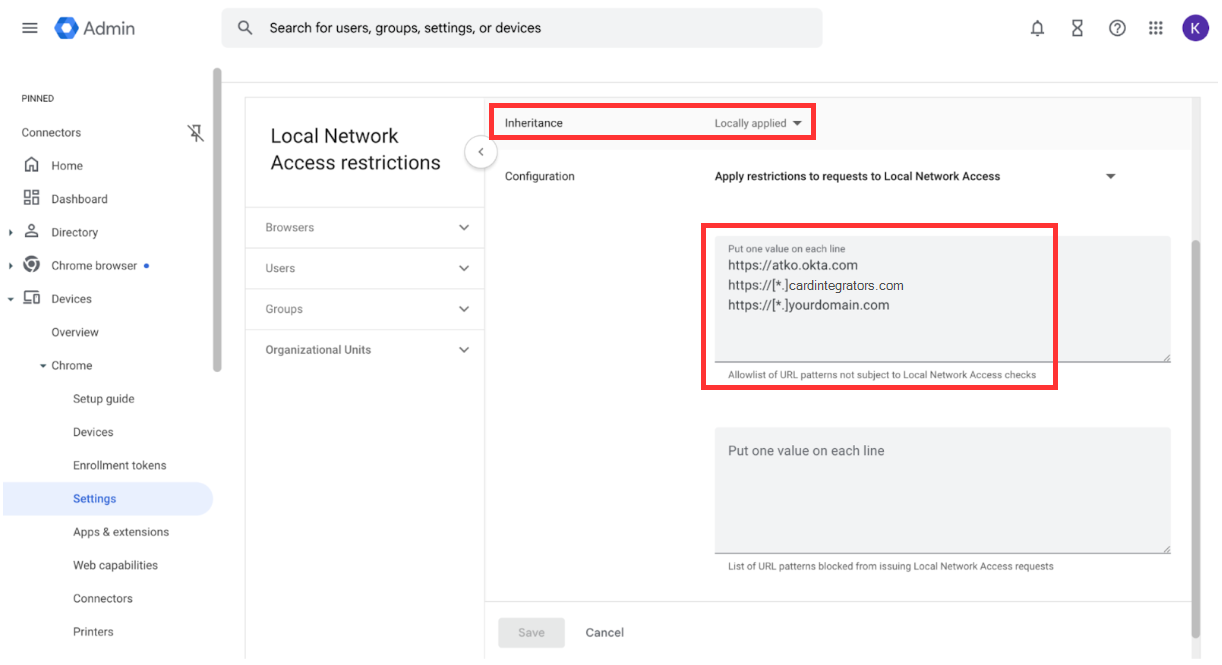 - Look for the LocalNetworkAccessAllowedForUrls policy and verify that the cardintegrators URLs are listed.